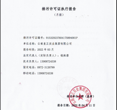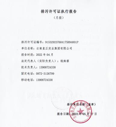 云南皇正實(shí)業(yè)集團(tuán)有限公司4月排污許可執(zhí)行報告