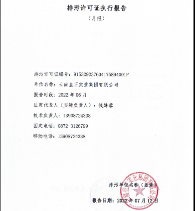 云南皇正實(shí)業(yè)集團(tuán)有限公司 2022年10月排污許可執(zhí)行報告月報