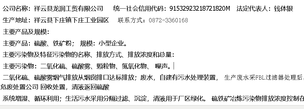 祥云縣龍潤工貿(mào)有限公司環(huán)保管理信息公開